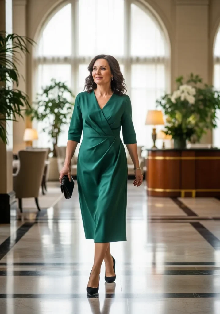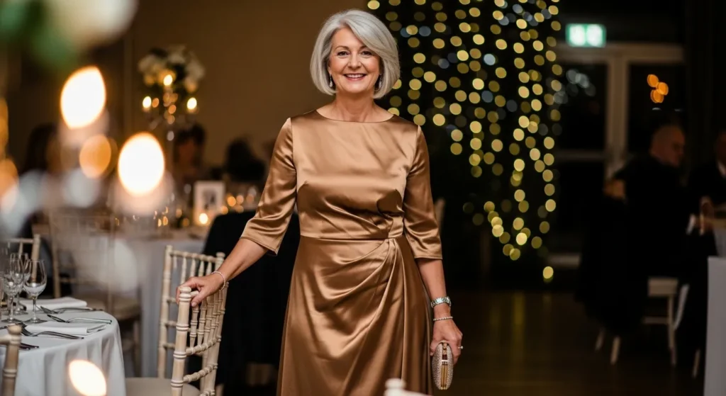I think this is such a flattering choice for evening weddings because the color is rich yet neutral enough to feel timeless. The satin fabric moves so beautifully when you walk, which instantly adds that chic factor. It feels modern, polished, and perfect for a mother of the bride who wants something elegant but not predictable.