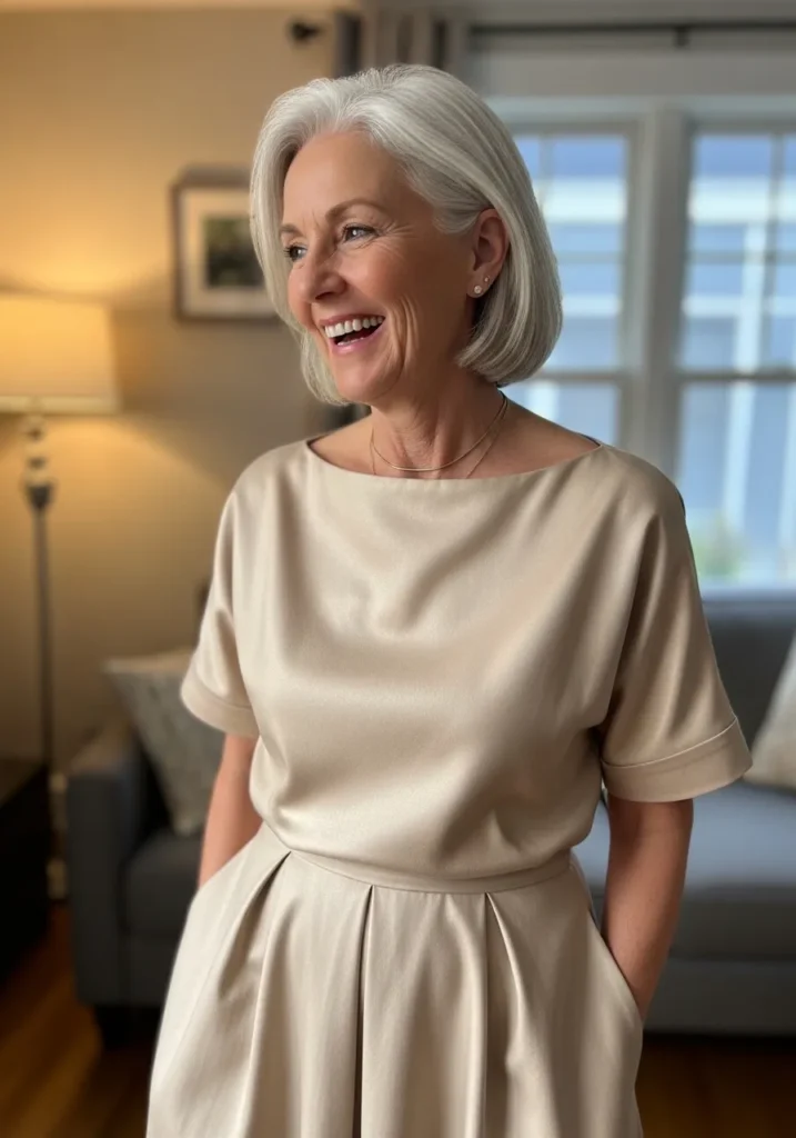 This look features a soft champagne satin dress with a sleek column silhouette, subtle draping at the waist, and clean elbow length sleeves that feel modern and refined. The silky fabric catches the light beautifully, creating gentle movement and a soft glow, while the minimalist design keeps everything looking polished and timeless. Paired with simple heels and delicate jewelry, the whole outfit feels sophisticated without being stiff.
