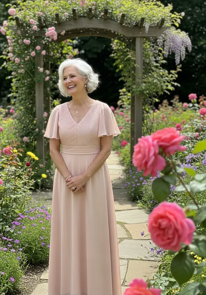 This soft blush maxi dress features a gentle V neckline, flutter sleeves, and a flowing skirt that moves beautifully in natural light. The lightweight fabric creates an airy and graceful silhouette, while the soft pink tone adds a fresh romantic feel. Set against a garden backdrop, the whole look feels light, feminine, and effortlessly elegant.