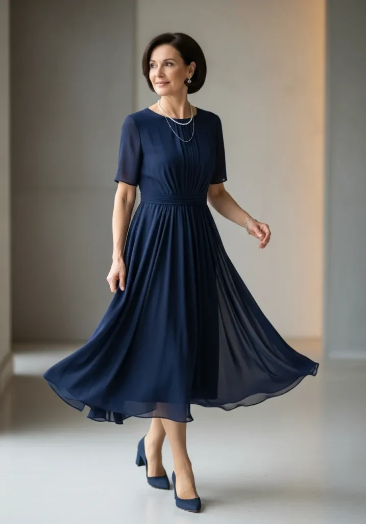 This navy chiffon dress features a softly pleated skirt, a defined waist, and a relaxed short sleeve bodice that feels both comfortable and refined. The airy fabric creates light movement with every step, giving the entire look a graceful and effortless vibe. The deep navy tone keeps it classic, while the flowing shape gives it a fresh and current feel.
