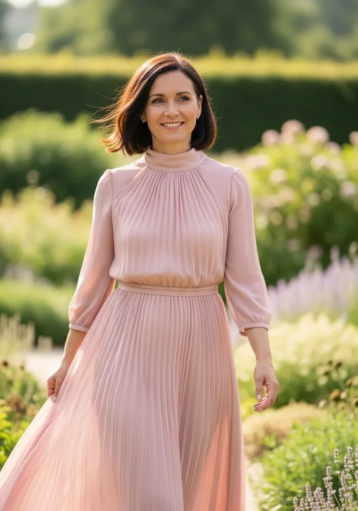 This blush pink dress features soft pleating, a gently defined waist, and flowing long sleeves that feel light and romantic. The airy fabric moves beautifully in natural light, creating a dreamy silhouette that looks right at home in an outdoor setting. The muted pink tone feels soft and modern, giving the whole outfit a fresh and feminine touch.