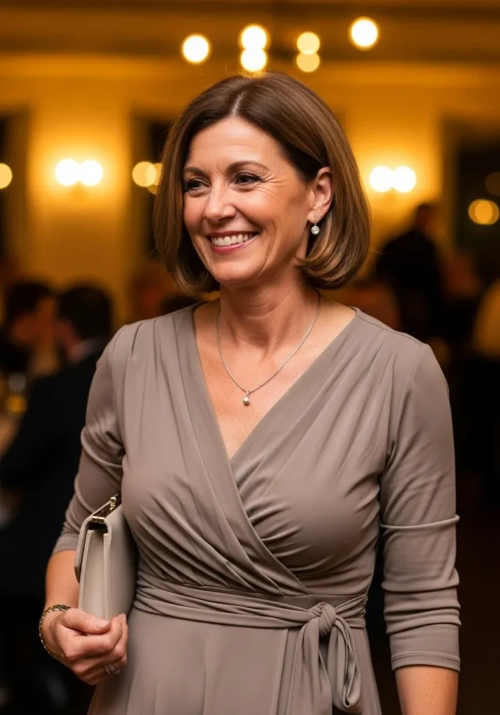This taupe wrap style dress features gentle ruching at the waist, a flattering V neckline, and a flowing skirt that creates beautiful movement. The soft fabric drapes naturally, giving the whole outfit a relaxed elegance that feels perfect for evening celebrations. The neutral tone keeps it timeless while the silhouette feels current and wearable.