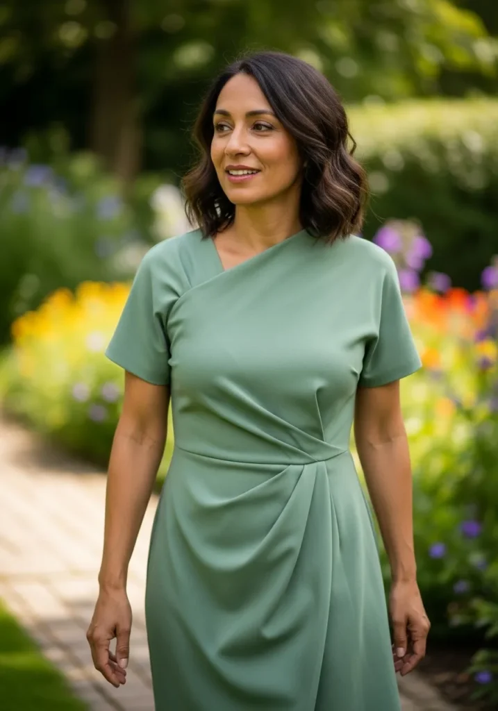 I love this look because it feels current without being loud. The color is fresh and flattering, and the silhouette is comfortable yet polished. It is perfect for daytime or outdoor weddings when you want something chic, simple, and beautifully wearable.