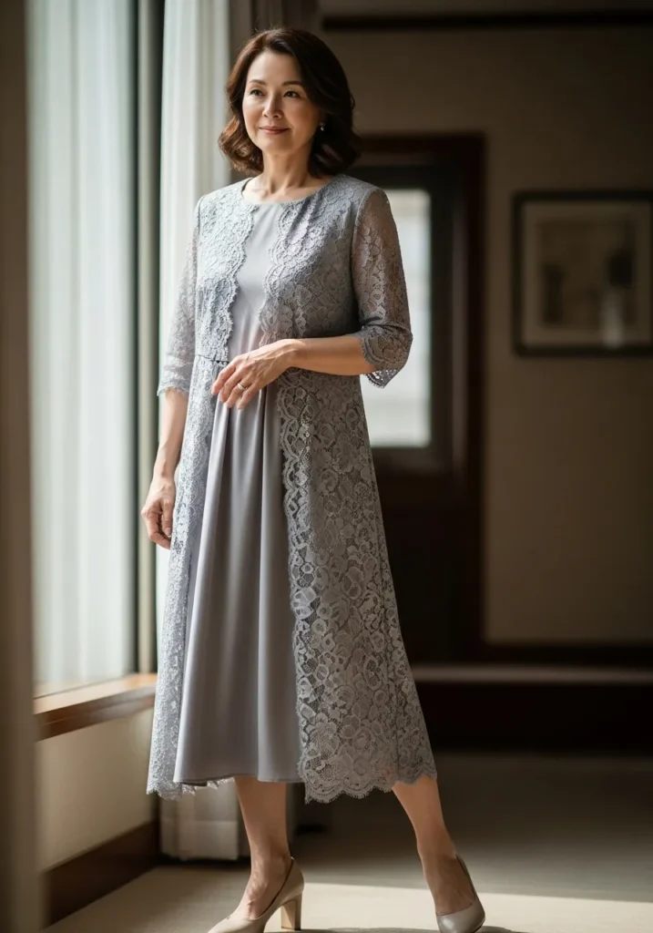 This outfit features a soft gray midi dress with a delicate lace overlay, sheer three quarter sleeves, and a gently flowing skirt that moves beautifully in natural light. The fitted bodice keeps the look polished, while the airy fabric adds softness and romance. The muted tone feels calm and refined, making it a lovely option for both indoor and daytime weddings.