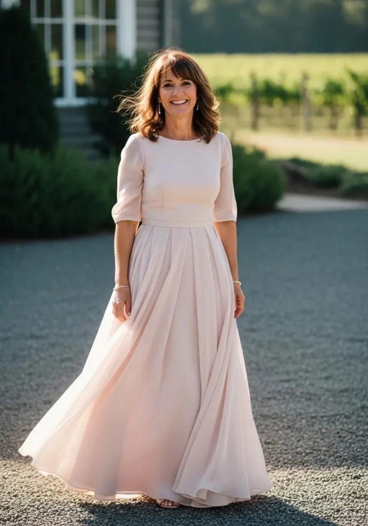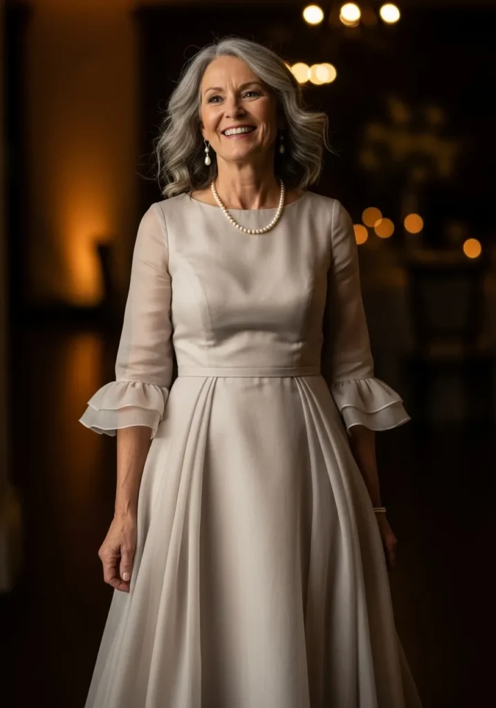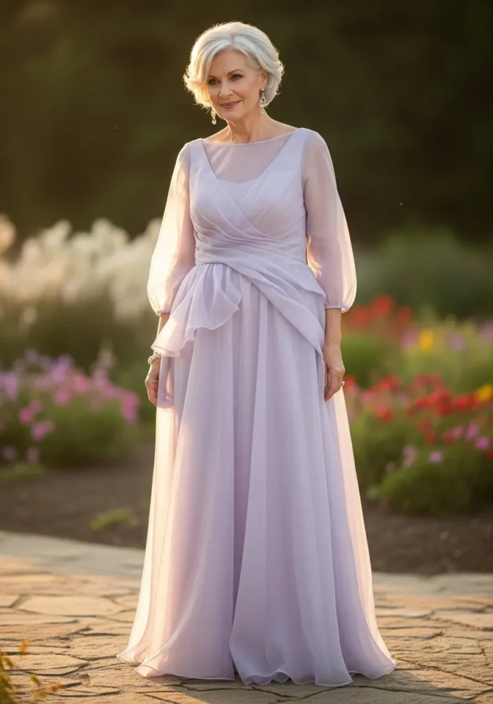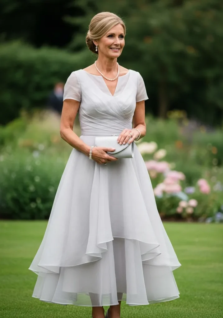 I think this style is perfect for mothers who love simple elegance with a contemporary twist. The soft gray shade feels fresh, refined, and incredibly chic, especially in bright garden settings.