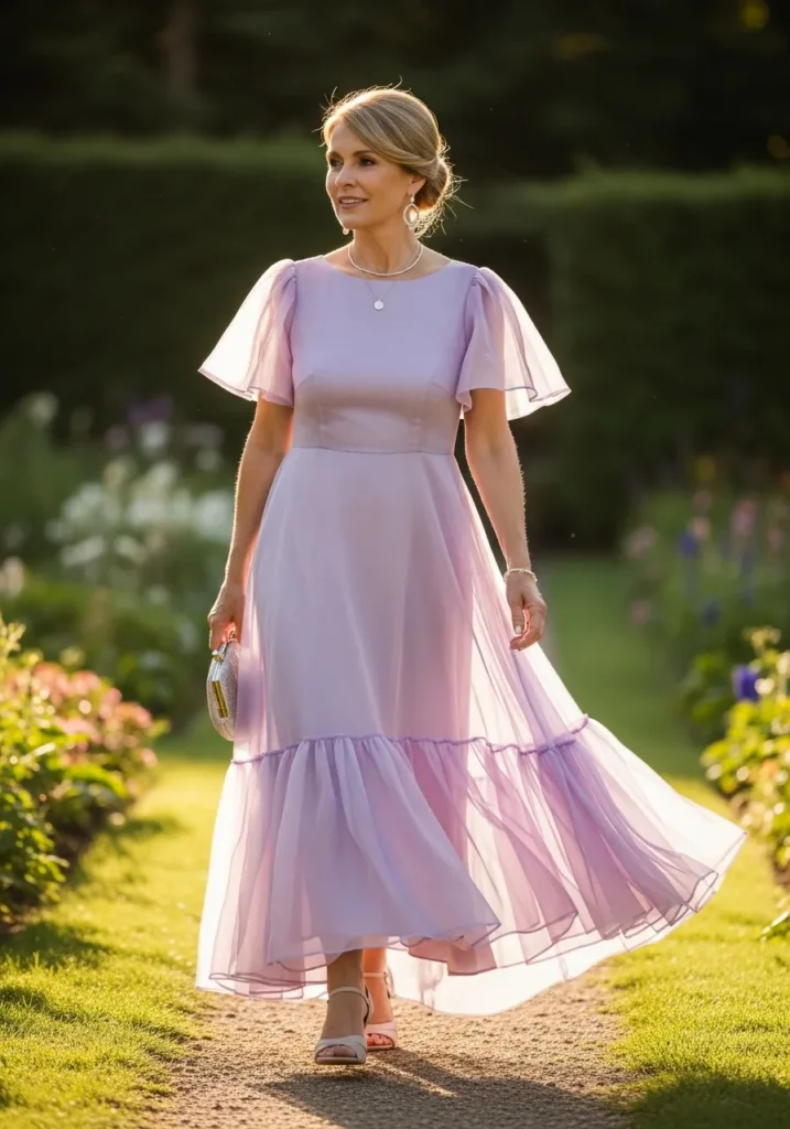 Lilac Organza Dress with Flutter Sleeves and Soft Movement