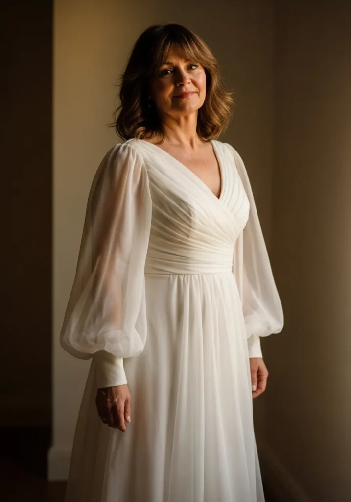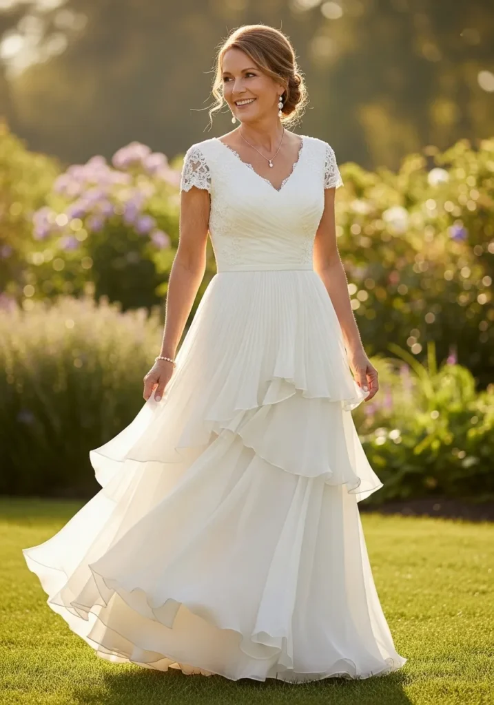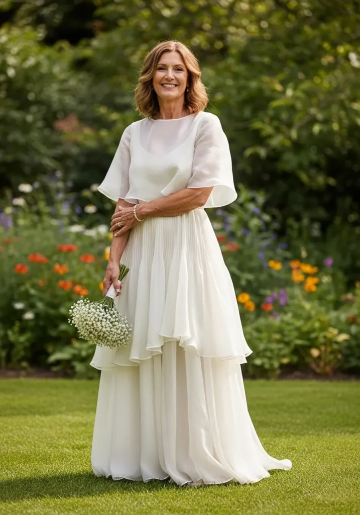I think this style feels incredibly special, especially for mothers who want something graceful with a touch of romance. The airy layers and soft ivory tone come together beautifully, creating a look that feels light, joyful, and full of charm.