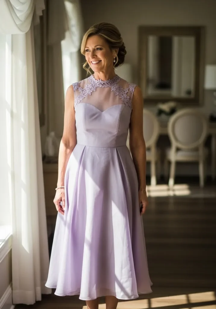 I am obsessed with how chic this style feels for daytime weddings or intimate ceremonies. The soft lavender color feels gentle and romantic, and the overall silhouette strikes a beautiful balance between elegance and easy comfort.