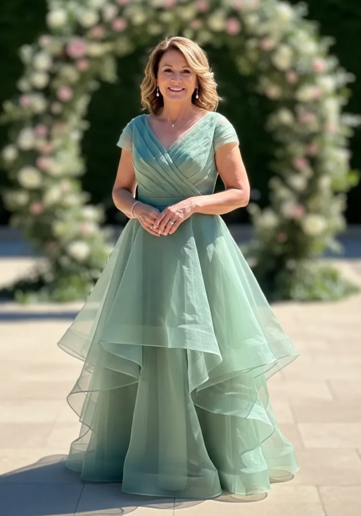 This mint green organza dress showcases layered tiers that flow softly down the skirt, creating a graceful and airy silhouette. The soft mint shade feels refreshing and elegant, especially when paired with garden surroundings.
