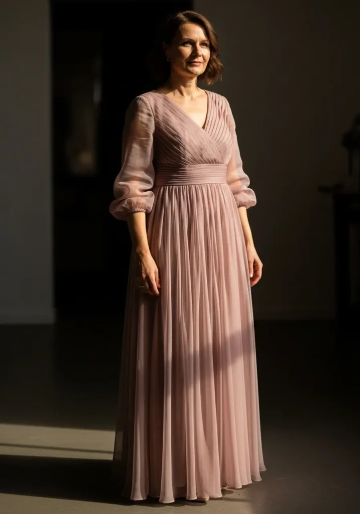 This mauve organza gown features a pleated bodice, sheer sleeves, and a flowing skirt that drapes beautifully from the waist. The dusty mauve color adds warmth and depth while still feeling soft and elegant.