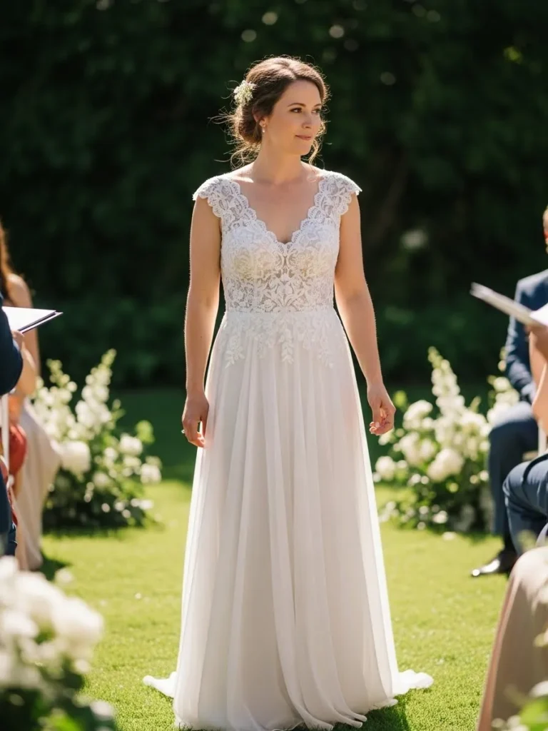 I love how effortless this bridal look feels under the summer sun. It looks comfortable, romantic, and timeless without trying too hard. This is the kind of dress that feels perfect for walking down a grassy aisle with a gentle breeze.