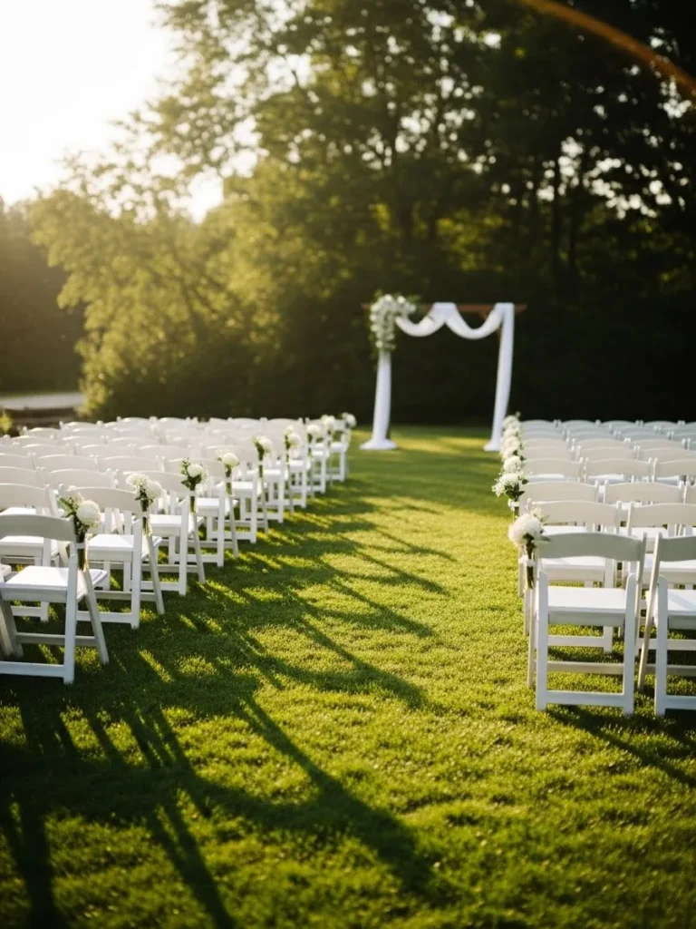 The ceremony space features white folding chairs lined neatly along a grassy aisle leading to a simple arch. The sunlight filters through the trees, creating soft shadows across the lawn. The setup feels clean, elegant, and beautifully balanced with nature.