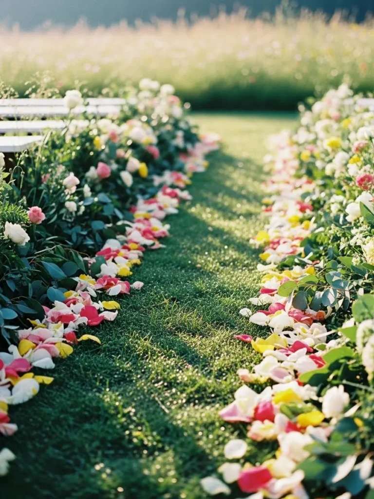 The aisle is decorated with scattered flower petals in soft pinks, whites, and warm tones running through lush green grass. The petals create a gentle path that feels organic and romantic without feeling overly styled. Everything blends naturally into the outdoor surroundings.