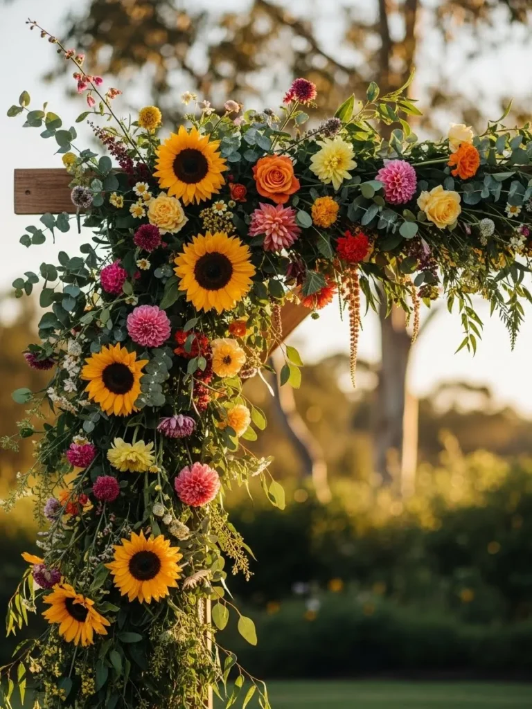 The wooden wedding arch is decorated with sunflowers, colorful blooms, and flowing greenery that frame the ceremony space beautifully. The bright flowers pop against the natural background and catch the warm sunlight perfectly. It feels cheerful, welcoming, and full of summer charm.