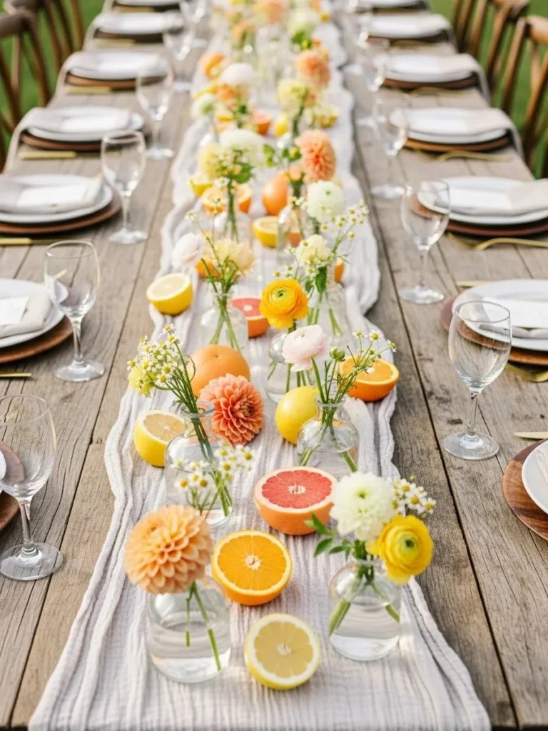 The long wooden table is styled with a flowing runner filled with sliced lemons, oranges, and soft yellow florals arranged down the center. Clear glassware and simple place settings keep the look clean while letting the citrus details shine. Everything feels bright, fresh, and perfectly suited for an outdoor summer reception.