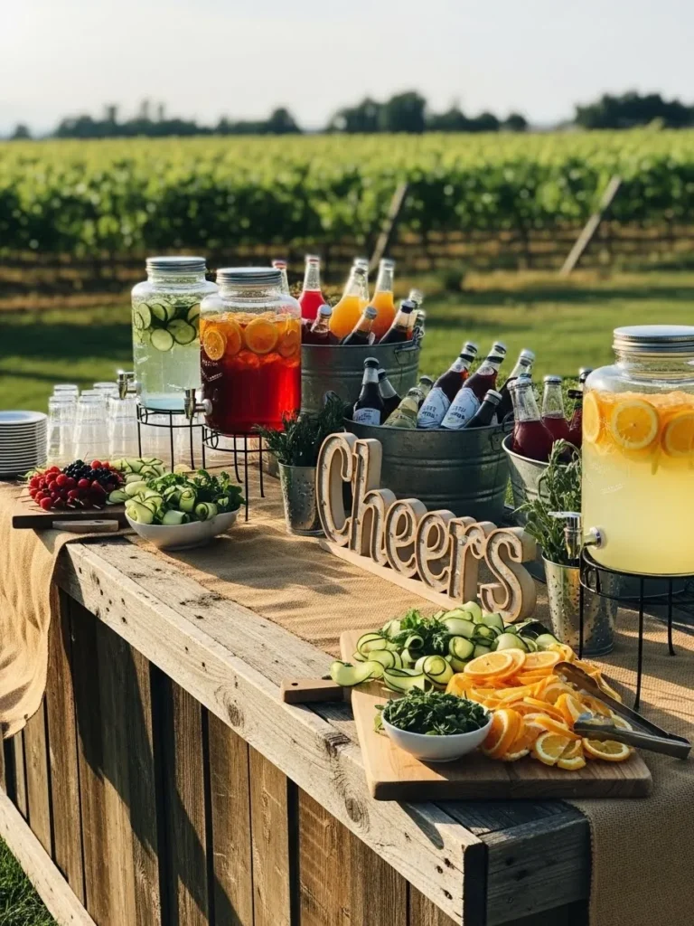 The drink station is set on a wooden table and filled with large glass dispensers of colorful beverages, fresh fruit garnishes, and stacked glasses ready for guests. A casual handwritten sign adds a relaxed touch, while the vineyard backdrop gives the whole setup a warm summer vibe. It feels inviting and easy to enjoy.