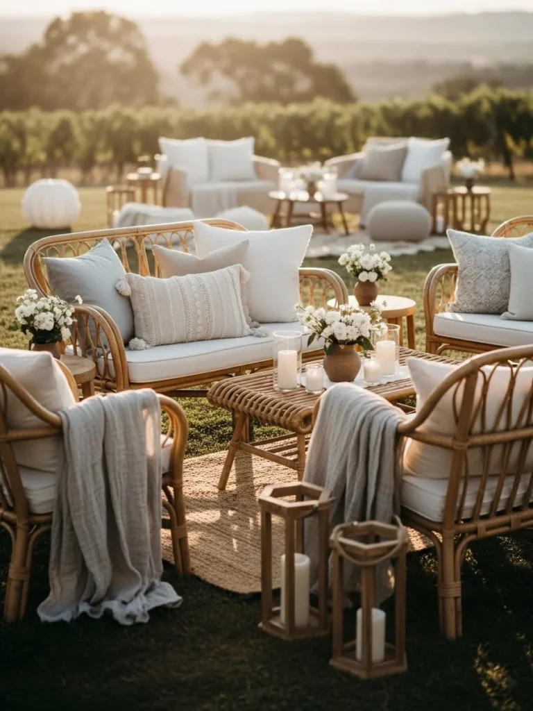 The lounge area features woven seating, plush cushions, soft throws, and low tables arranged for relaxed conversation. Neutral tones keep the space calm, while layered textures add warmth and comfort. Set outdoors, it feels like a dreamy extension of a living room under the open sky.