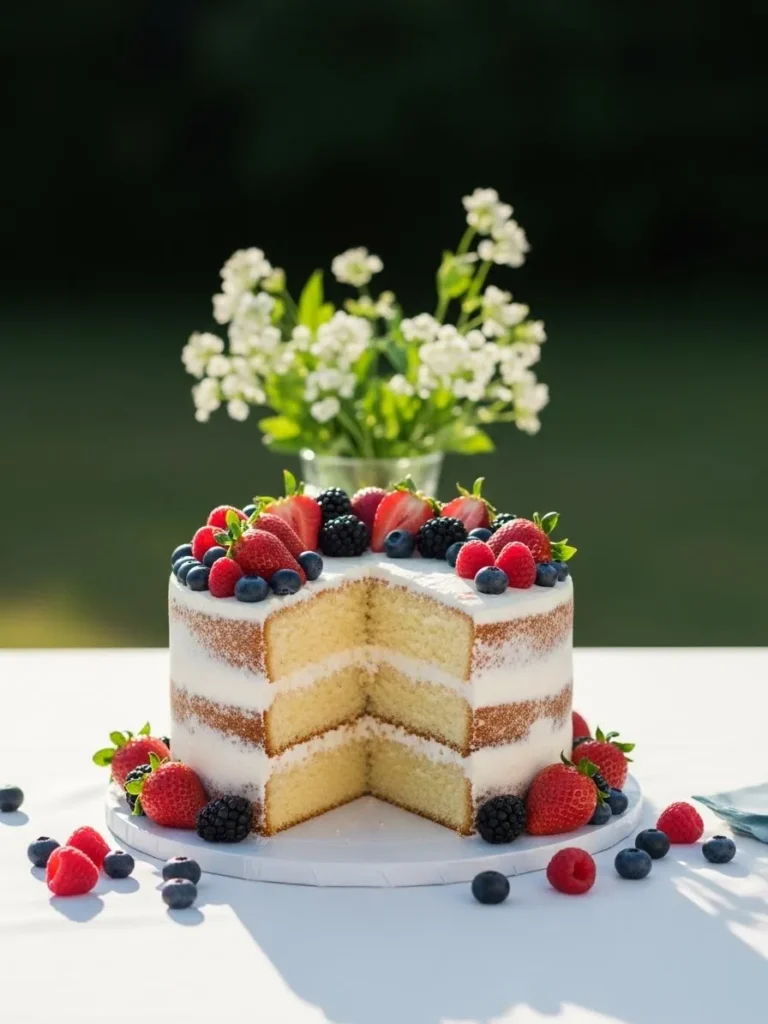 The cake is a simple layered design topped with fresh berries and delicate white flowers. The exposed layers give it a light and airy look that feels perfect for warm weather celebrations. Set against a soft natural background, it feels fresh and understated.