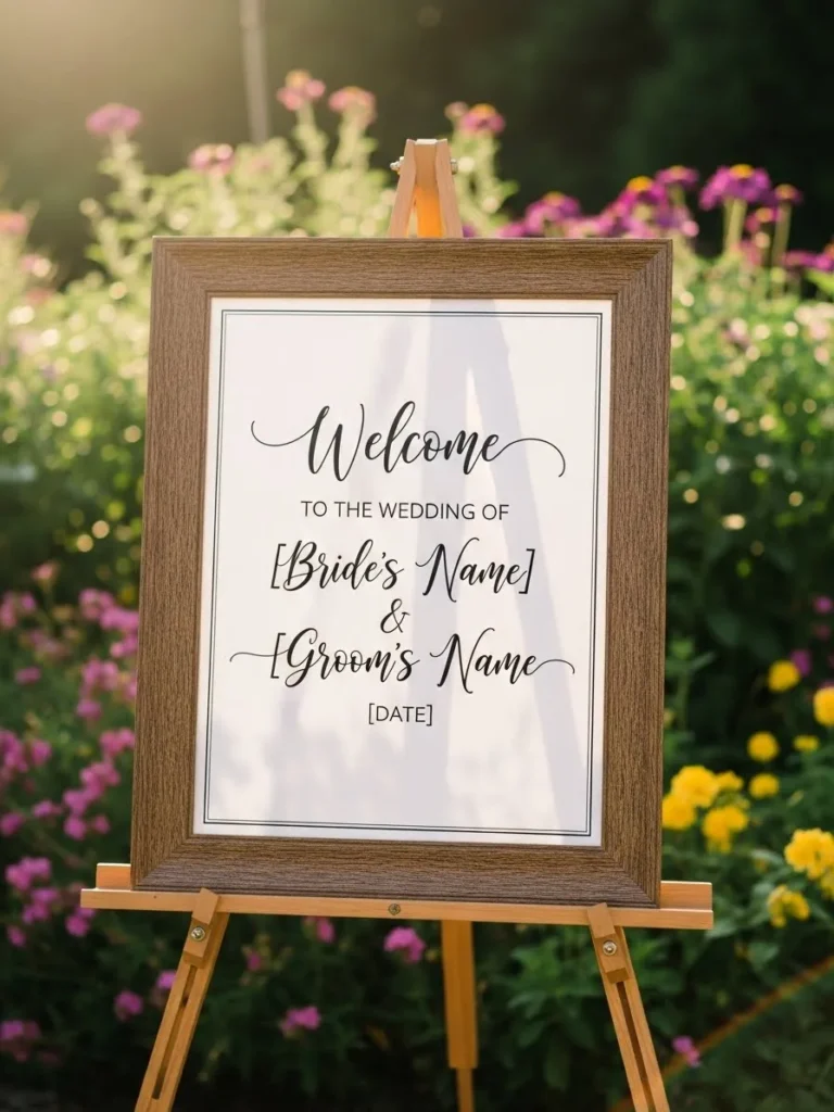 The welcome sign is displayed on a wooden easel surrounded by soft florals and greenery. The lettering feels classic and elegant while blending seamlessly with the garden setting. Everything about it feels warm and inviting from the very first glance.