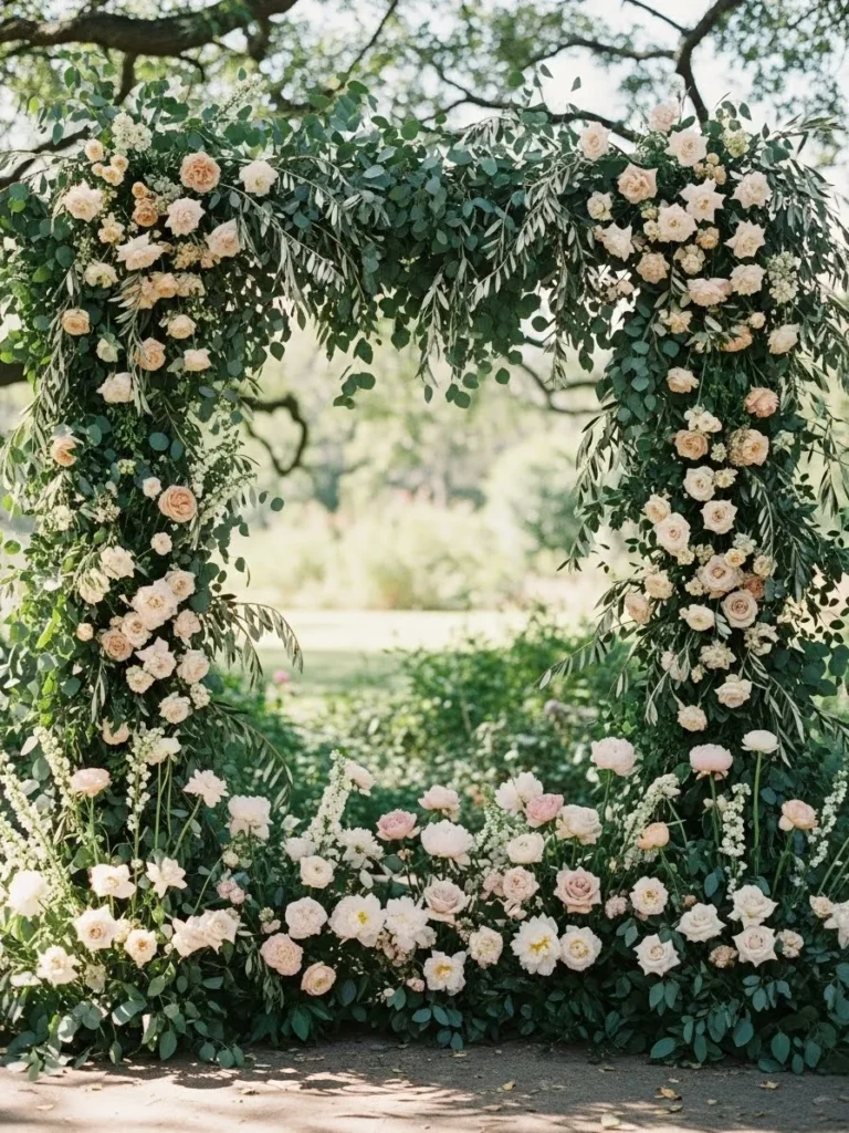 The ceremony arch is fully framed with soft blush and white flowers mixed with flowing greenery. The rounded shape creates a romantic focal point that feels both natural and elegant. Sunlight filtering through the leaves makes the entire setup feel magical.