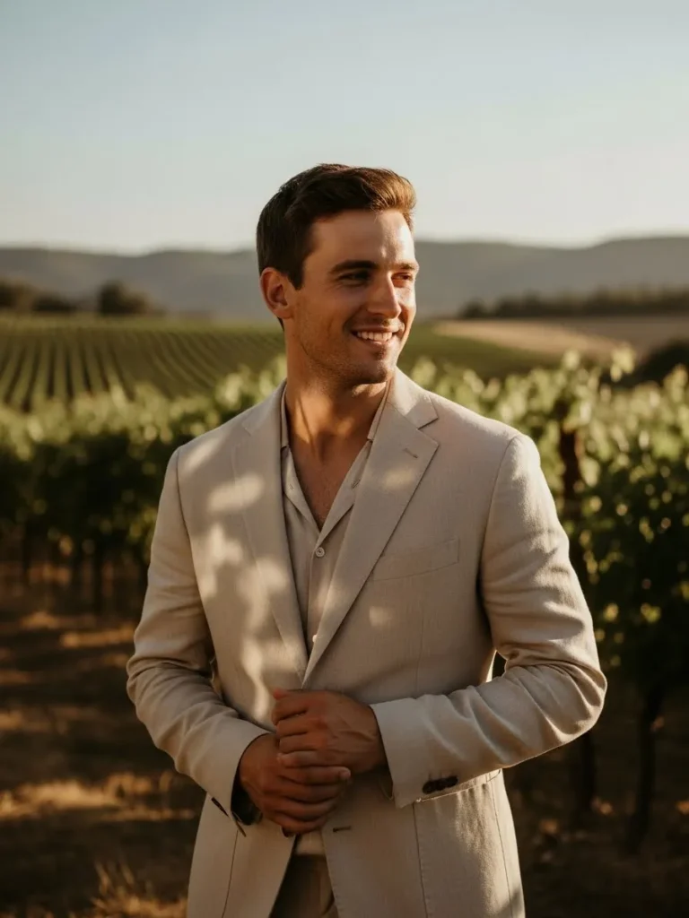 The groom is dressed in a light beige suit with a relaxed fit that feels perfect for warm weather. The open collar adds an easy elegance, while the soft fabric keeps the look breathable and modern. Surrounded by vineyard scenery, the suit blends beautifully with the natural tones of the setting.