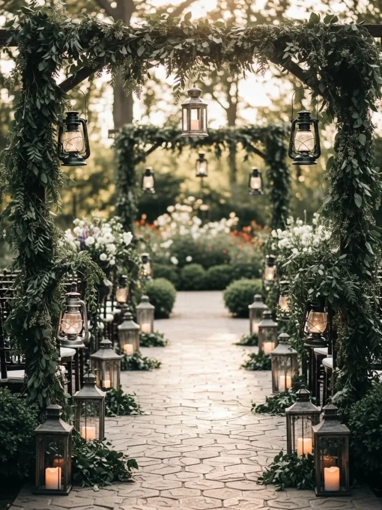 The walkway is lined with greenery and softly glowing lanterns that guide guests through the garden. The foliage frames the path beautifully, while the lanterns add warmth and depth as the light fades. It feels romantic and slightly enchanted.