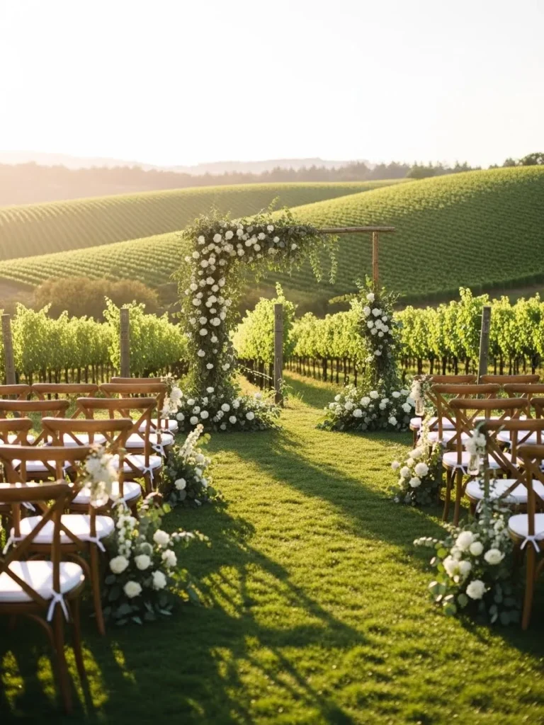 Rows of wooden chairs are set along a grassy aisle with floral accents leading toward a simple ceremony arch. Rolling vineyard views stretch out in the background, adding natural beauty to the scene. The whole setup feels open, airy, and peaceful.