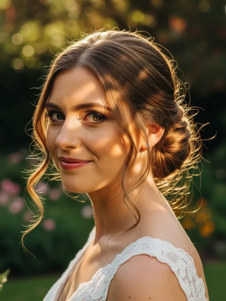 The bride is wearing her hair in a low updo with loose tendrils framing her face. The style feels soft and natural, with gentle texture that catches the light beautifully. Paired with a delicate dress, the look feels timeless and feminine.