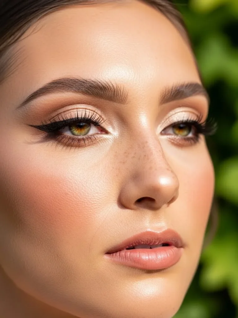 The makeup focuses on glowing skin, soft bronzed tones, and defined eyes with a subtle shimmer. The brows are natural, the lashes are full but not heavy, and the lips have a soft rosy finish. Everything feels fresh and polished without looking overdone.