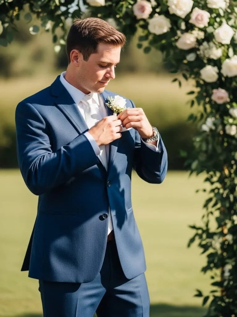 The groom is wearing a deep blue suit paired with a crisp white shirt and boutonniere. The tailored fit gives a clean and classic silhouette that stands out beautifully against the greenery. Small details like the boutonniere add a romantic touch without overpowering the look.