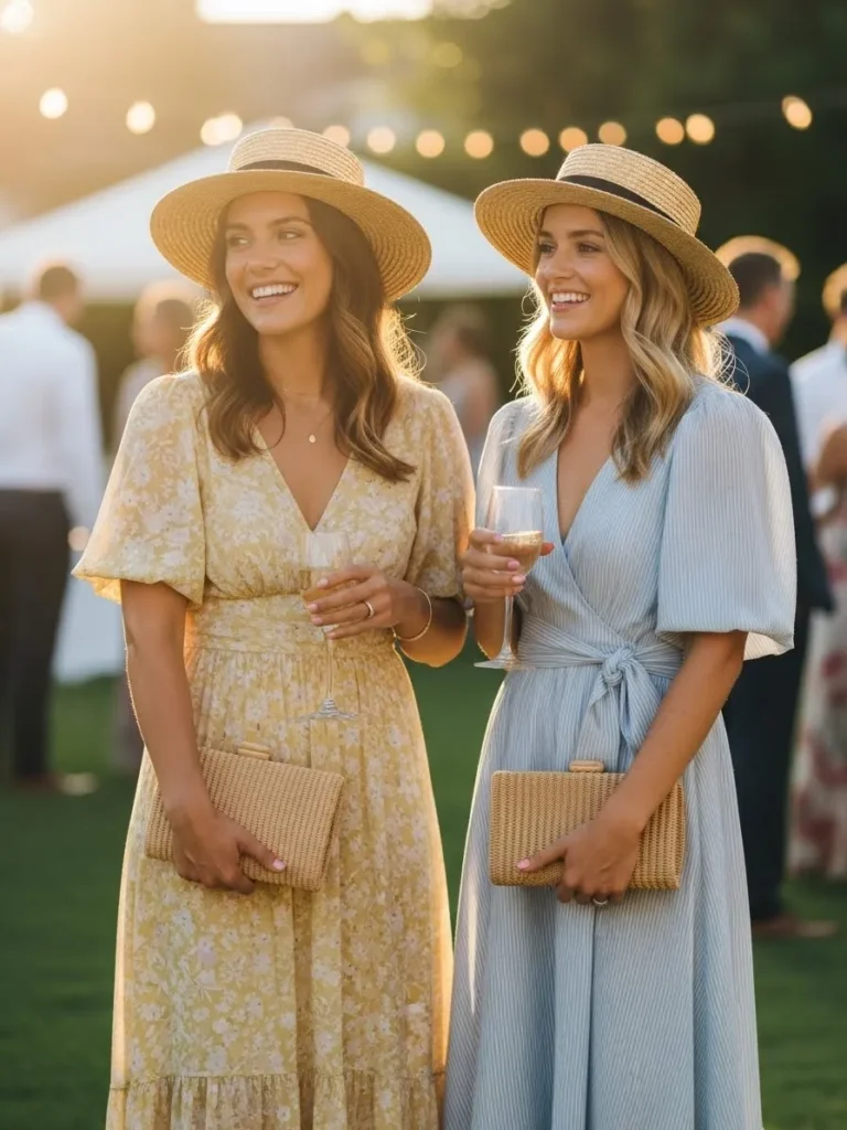 The guests are dressed in light, breezy dresses in soft neutral and pastel tones. Straw hats and relaxed silhouettes make the outfits feel perfect for a sunny outdoor celebration. The overall vibe is stylish but comfortable, with an easy summer elegance.