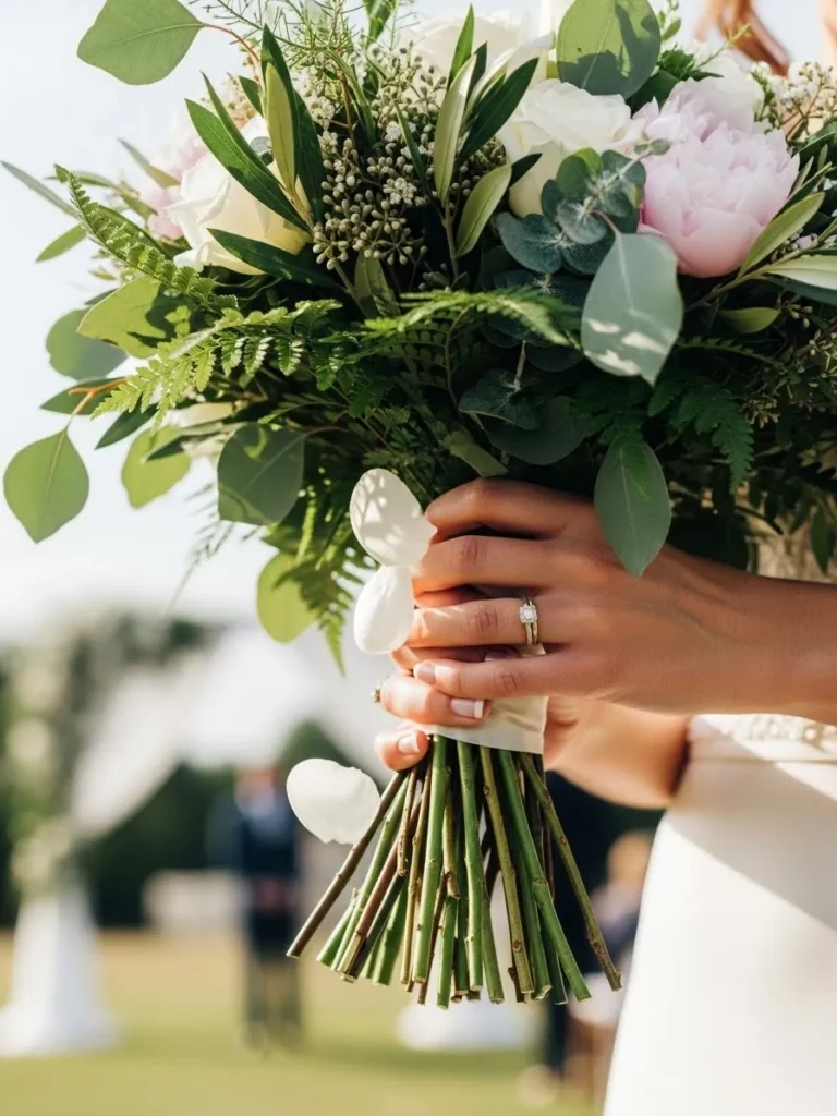 The bouquet features a fresh mix of leafy greens, soft white blooms, and subtle blush accents tied together with natural stems left exposed. The greenery adds texture and movement, while the flowers keep the look light and romantic. It feels organic and perfectly suited for an outdoor summer setting.