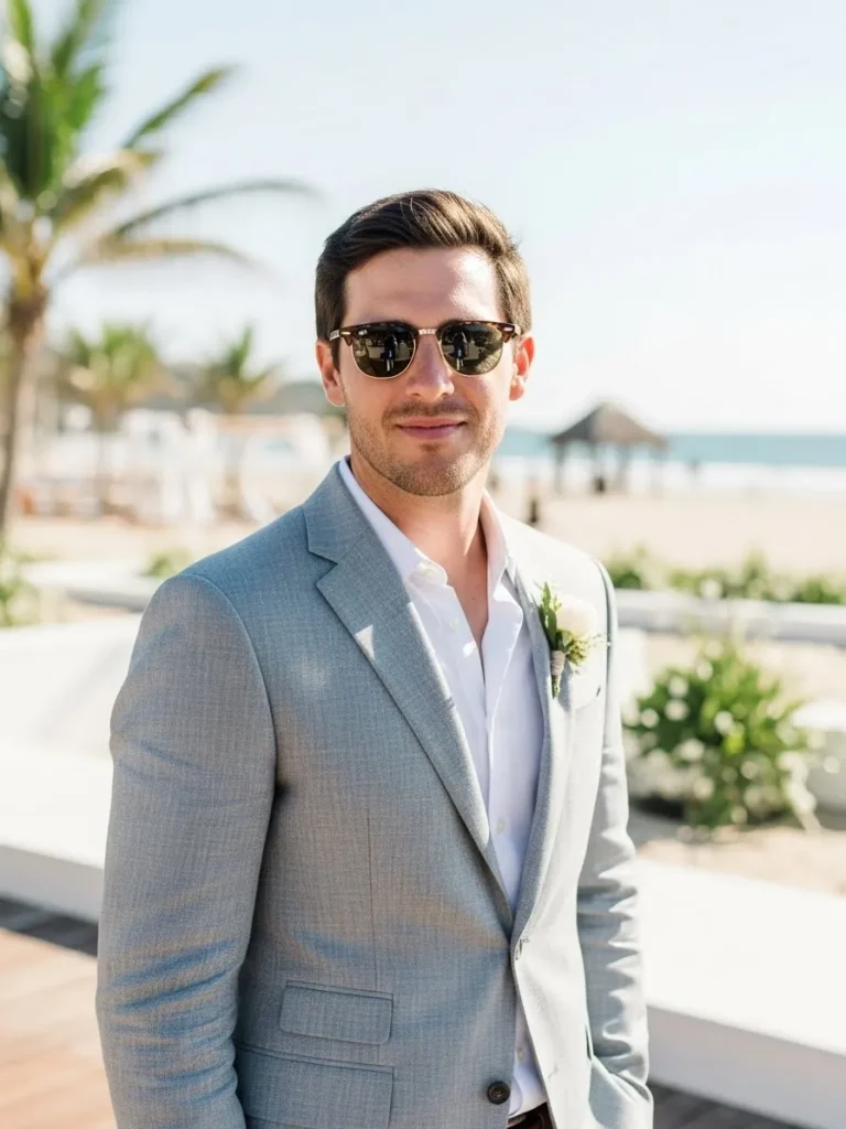 The groom is wearing a light blue suit paired with a crisp white shirt and sunglasses, creating a relaxed yet polished beach wedding look. The tailored fit keeps the outfit sharp, while the light color reflects the sunny seaside setting. Everything feels breathable and clean for a warm outdoor celebration.