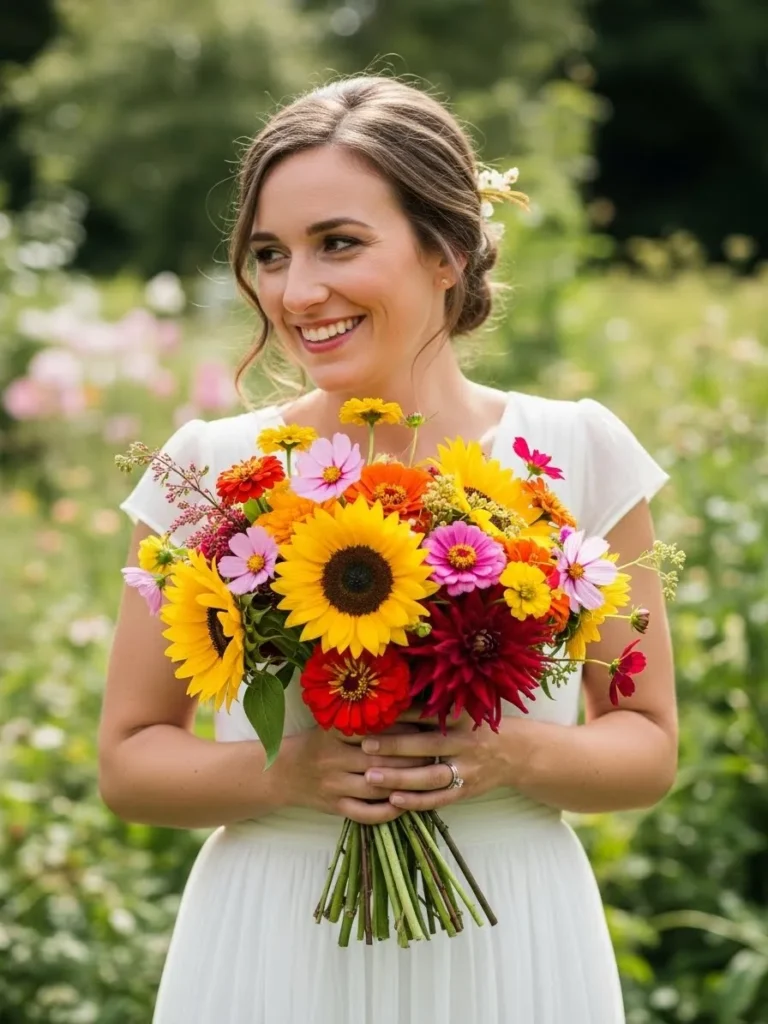 The bride is holding a vibrant bouquet filled with sunflowers, colorful wildflowers, and rich greenery. The bold colors instantly stand out against her simple white dress and the natural outdoor backdrop. It feels joyful, playful, and full of summer energy.