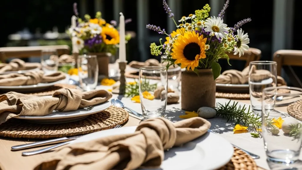 Sunny Outdoor Table Setting with Wildflowers