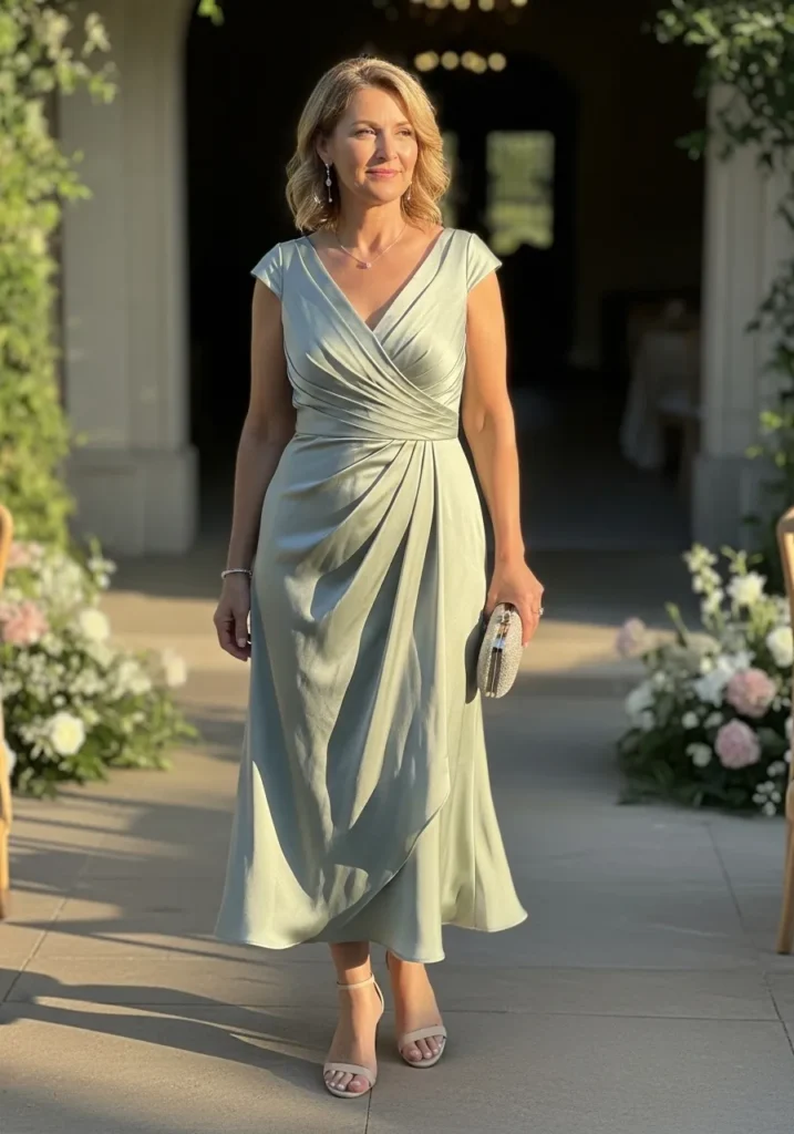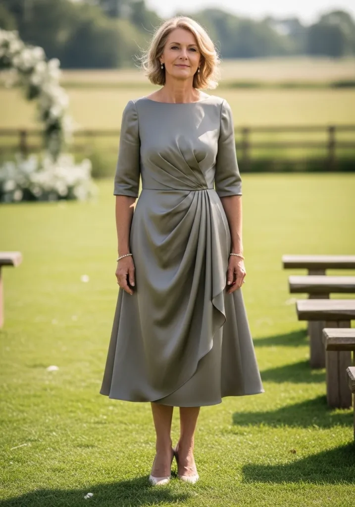This look features a polished sage green midi dress with a softly draped knot detail at the waist, gentle pleating through the skirt, and relaxed three quarter sleeves that feel both modern and timeless. The clean neckline and smooth fabric create an effortless silhouette, while the muted green tone blends beautifully with outdoor garden surroundings.