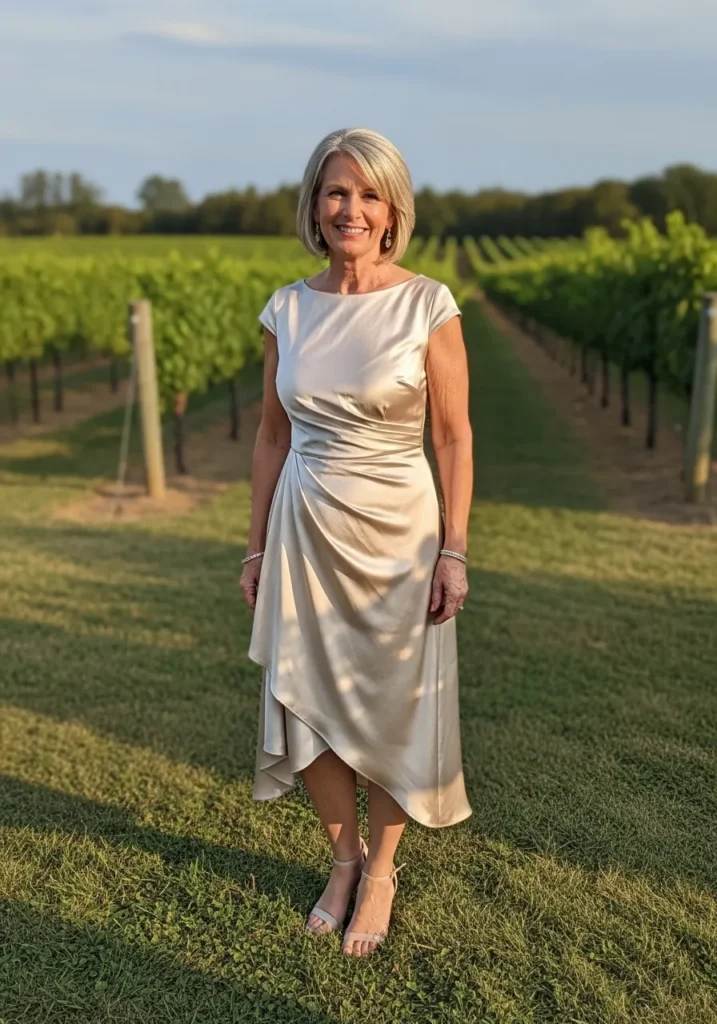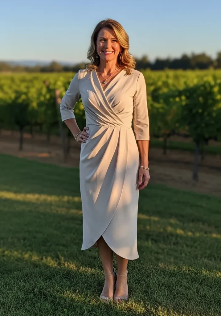 This soft beige midi dress highlights gentle draping, a flattering wrap bodice, and clean tailoring that creates a sleek and polished finish. The warm neutral tone pairs beautifully with outdoor vineyard surroundings, giving the look a relaxed yet refined presence.