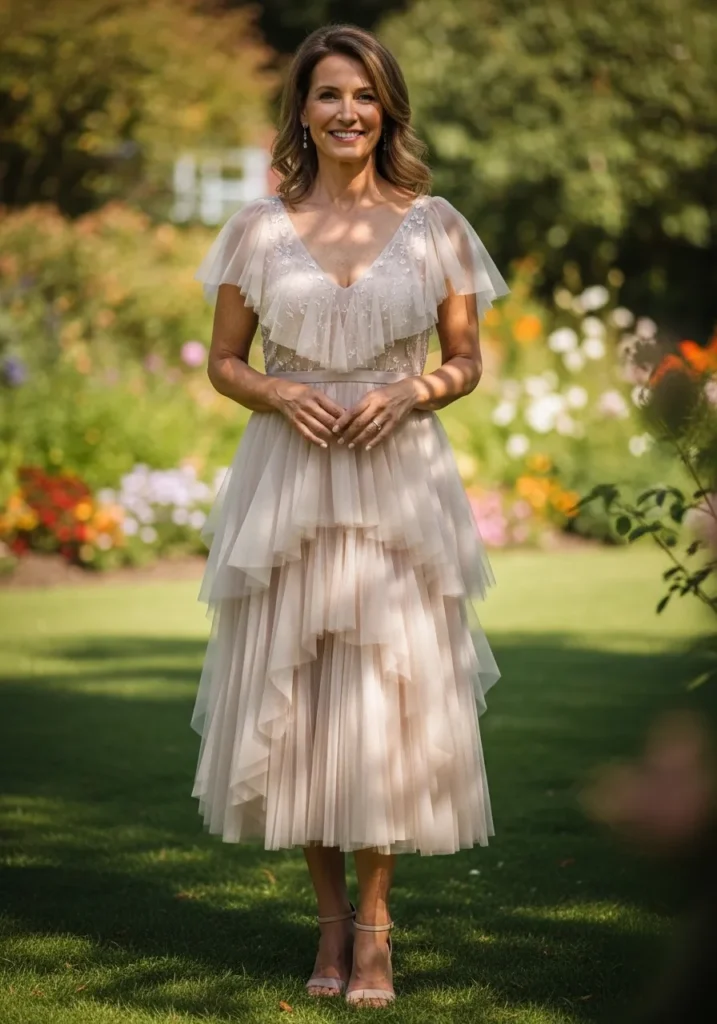This dreamy midi dress showcases delicate layers of soft tulle, fluttery short sleeves, and gentle gathering through the skirt for beautiful movement. The airy fabric catches the light perfectly, creating a soft romantic look that feels light and graceful among blooming garden surroundings.
