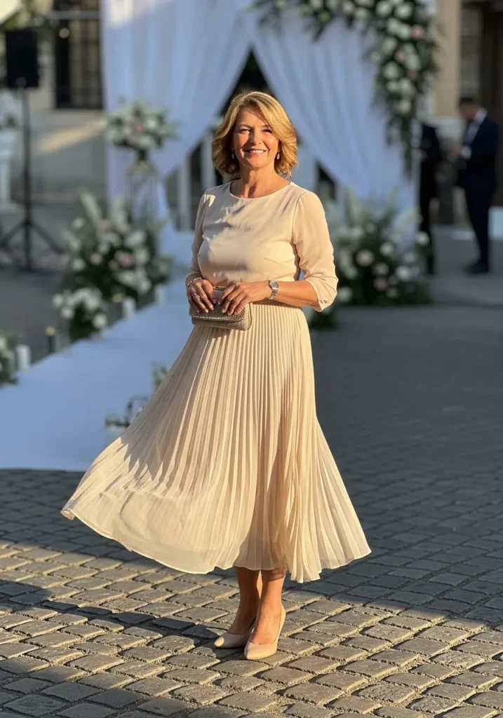 This champagne midi dress showcases delicate pleats that sway gracefully with every step, paired with soft long sleeves and a lightly cinched waist that creates beautiful movement. The airy fabric catches the light perfectly, giving the whole look a gentle glow that feels dreamy and polished.