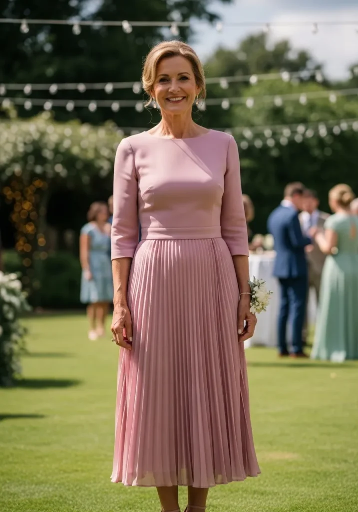 This blush pink midi dress showcases a smooth fitted bodice paired with a softly pleated skirt that adds lovely texture and movement. The gentle pastel tone feels fresh and joyful, while the clean lines keep the overall look refined and wedding appropriate.