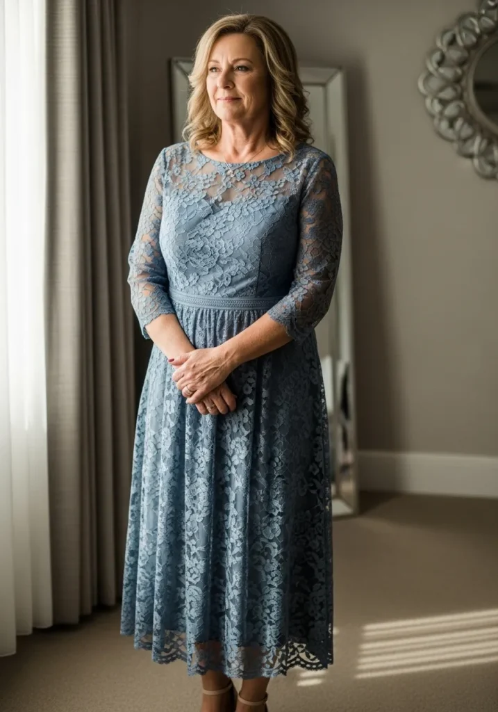 This dusty blue lace midi dress features intricate floral detailing, sheer three quarter sleeves, and a softly fitted waist that flatters the figure without feeling restrictive. The scalloped hem and delicate texture add depth, while the muted blue shade feels calm and sophisticated.