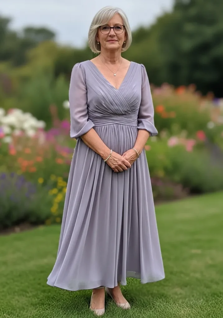 This soft lavender midi dress showcases a flattering wrap style bodice, delicate long sleeves, and a flowing skirt that moves beautifully with each step. The gentle pastel shade pairs perfectly with lush greenery, creating a calm and graceful overall look.