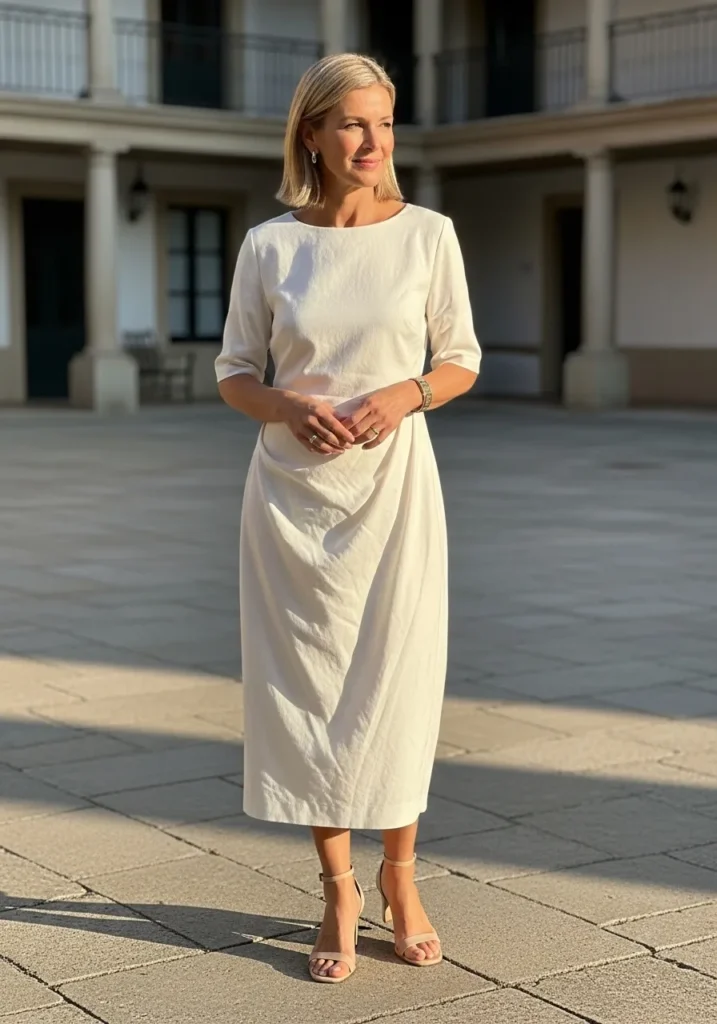 This ivory midi dress highlights clean lines, a softly structured waist, and subtle draping that creates a sleek and polished silhouette. The simplicity of the design allows the tailoring and fabric quality to shine, giving the whole look a modern and elevated feel.