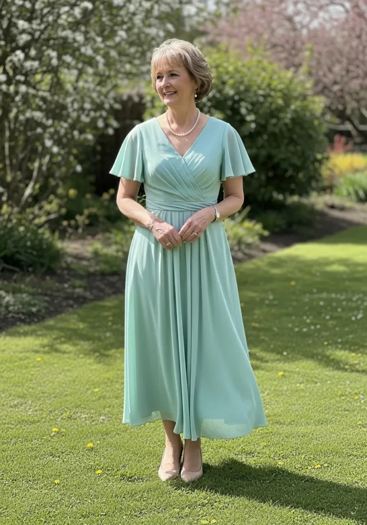 This look features a soft mint green midi dress with a relaxed V neckline, short flutter sleeves, and a gently flowing skirt that moves beautifully with every step. The lightweight fabric drapes naturally, creating an airy silhouette that feels effortless and perfectly suited for an outdoor spring celebration.