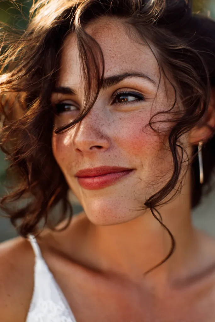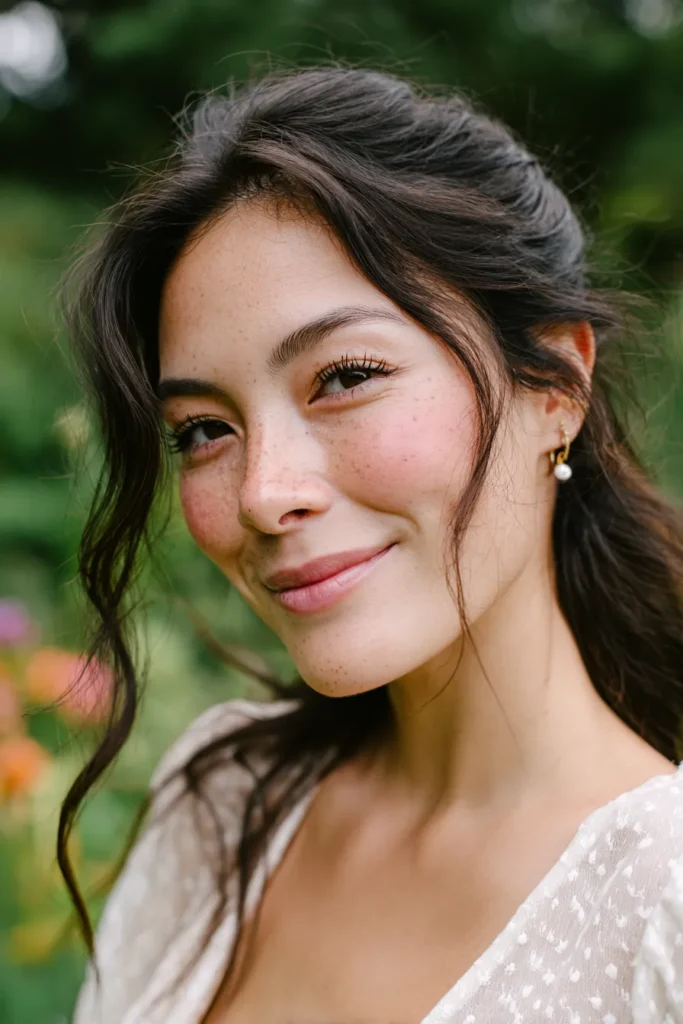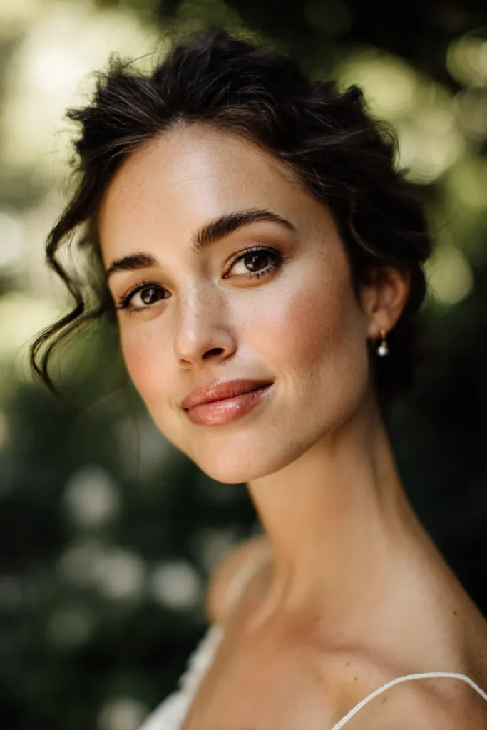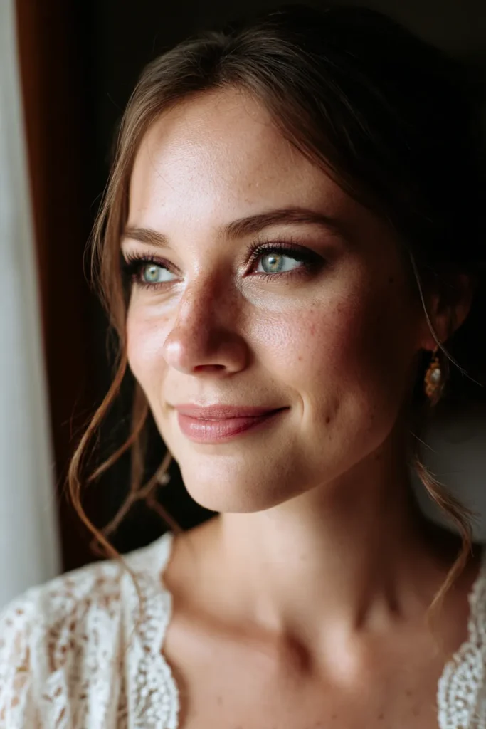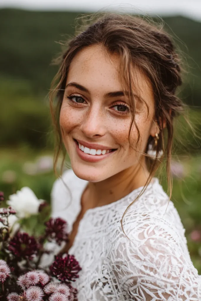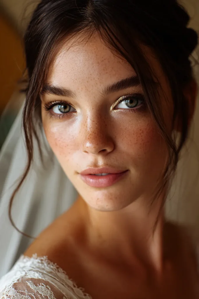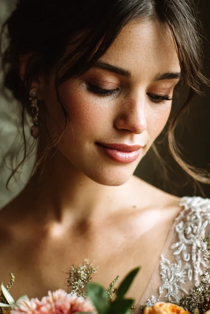 I love this look because it’s the definition of “your skin but better” and feels so genuinely happy and glowing. The decision to let her freckles take center stage makes the whole look incredibly relatable and charming. It works so well because the naturalness of the makeup contrasts beautifully with the intricate white lace of her gown. This effortless, chic style is absolutely perfect for a bohemian or relaxed garden bride. It’s totally stylish and proves you don’t need a lot of heavy makeup to look stunning on your wedding day.