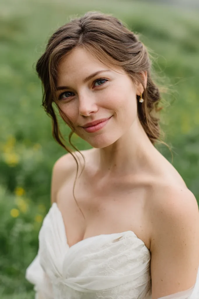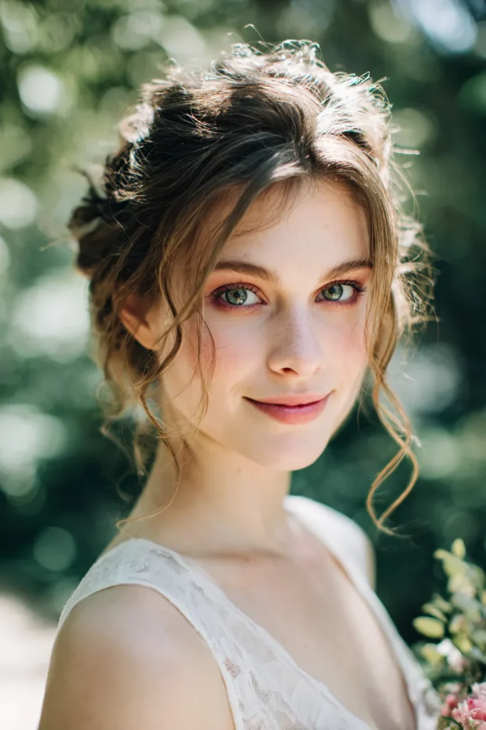 I adore this whole look because it’s the epitome of bohemian romance and perfectly complements a spring garden or countryside wedding. The eye makeup is just the right amount of dramatic without overpowering the rest of her face, which keeps it feeling fresh and modern. That undone, messy-chic updo is the real showstopper though, because it looks so effortless and dreamy. It’s so chic and flattering because the soft tendrils frame her face beautifully. I think this look is a total win for any bride who wants to feel gorgeous but not overdone.