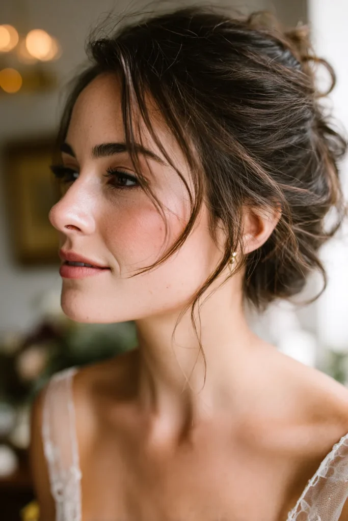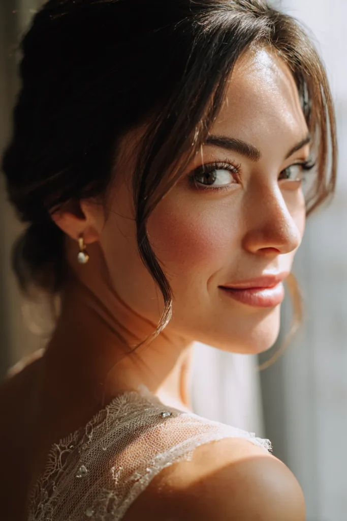 This close-up bridal shot beautifully showcases a natural but elevated makeup look, with a strong focus on a radiant complexion and soft warmth. Her cheeks feature a healthy, rosy flush that blends seamlessly into a gorgeous, luminous highlight, giving her skin a fresh, dewy finish. Her eyes are subtly defined with a soft liner, a touch of warm shadow, and full lashes, while her lips are a glossy nude-pink. Her dark hair is styled in a loose, textured updo with romantic waves framing her face, and she wears a delicate gold stud earring and a gown with sheer, intricate lace straps.