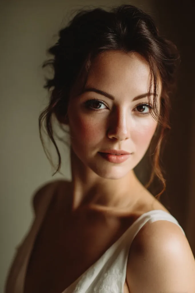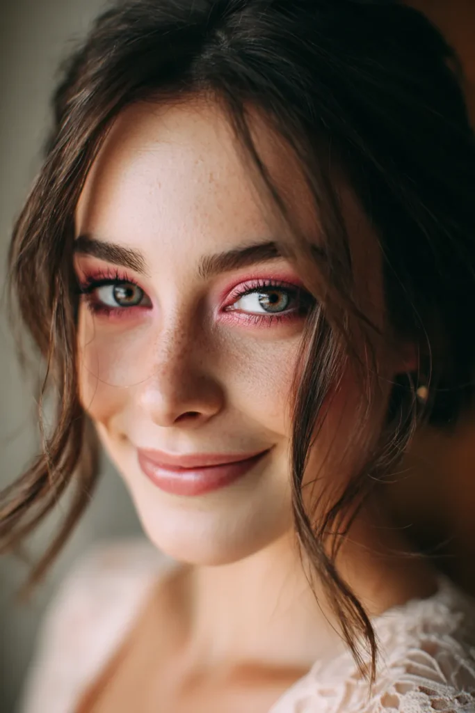 The makeup look is fresh and effortlessly chic, featuring soft, flushed cheeks that have a subtle pink tint, making the skin look dewy and youthful. The eyes are enhanced with delicate rosy tones, blending seamlessly into a soft, smoky eye look that feels romantic and airy. Full, natural lashes give the eyes just the right amount of definition, while the lips are tinted with a warm pink that complements the fresh-faced glow. Her loose, romantic hairstyle, with a few strands framing her face, adds to the natural, relaxed feel of the look.