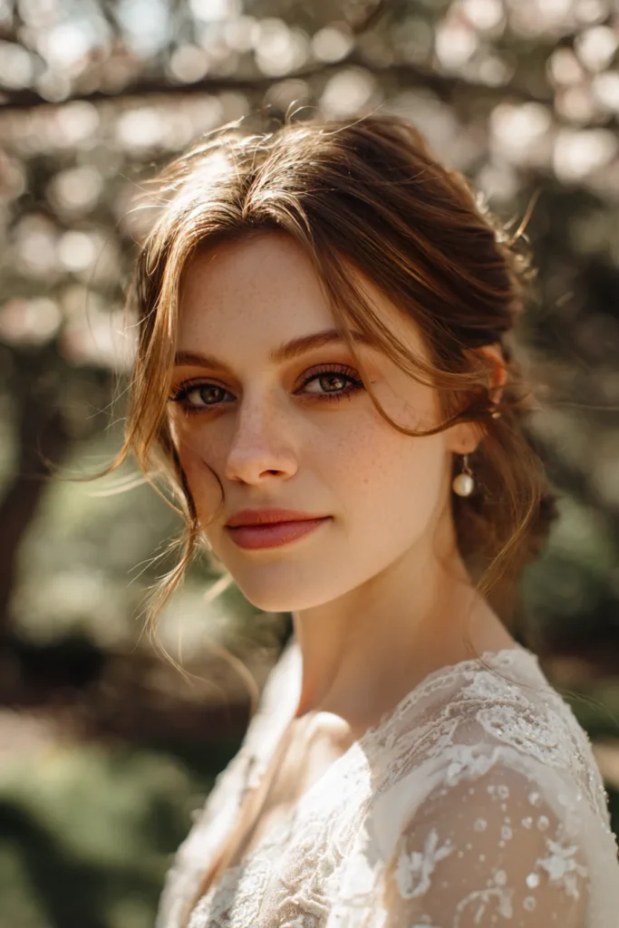 This gorgeous bridal portrait showcases a true masterpiece of natural makeup focused entirely on luminous, healthy skin. Her visible freckles add an authentic touch that is absolutely charming, complemented by subtle, warm tones on the cheeks for that perfect flushed look. She has subtly defined brows and warm neutral eyeshadow that keeps the eyes looking bright and airy, finished with a hint of glossy nude-pink lipstick to perfect her pout. The soft, textured updo with face-framing waves and a simple pearl drop earring completes this effortlessly elegant look.