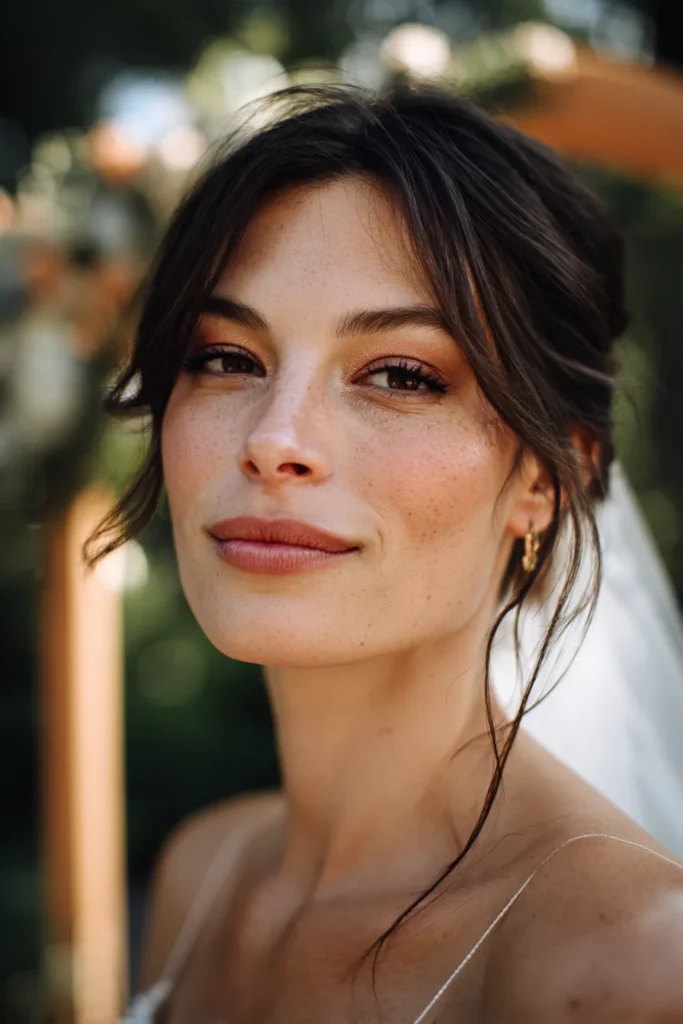 The makeup look feels soft and sun kissed with warm bronze tones across the eyes and a gentle flush on the cheeks. The skin looks fresh and luminous with freckles showing through for a natural finish. Lashes are defined but light, paired with softly brushed brows that frame the face without looking heavy. The lips are finished with a muted nude rose shade that feels effortless and romantic, while the loose updo and veil keep everything airy and relaxed.